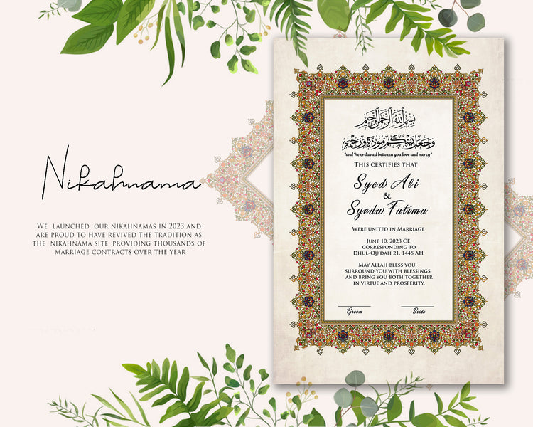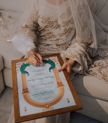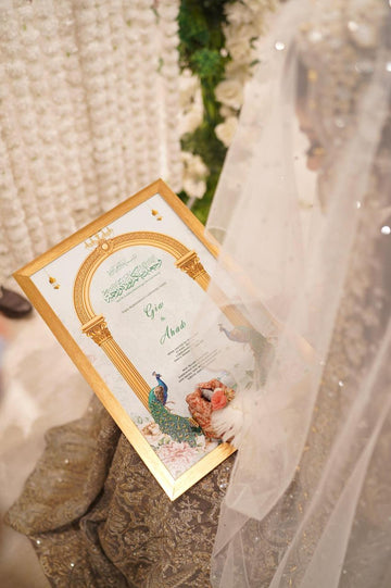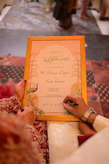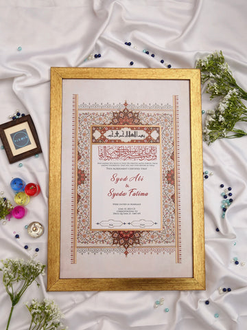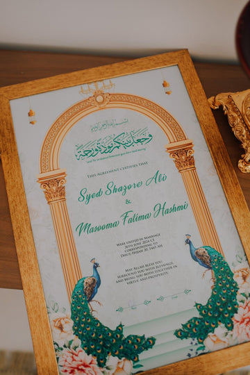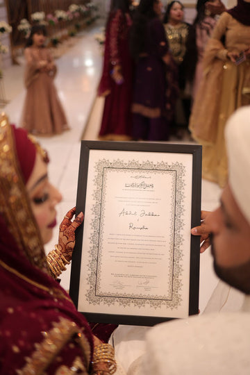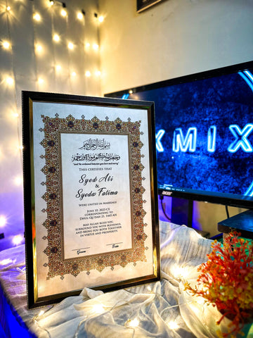 "Elegant and personalized Nikah Nama frames, crafted to commemorate the sacred union of two souls. Our custom frames beautifully showcase the intricacies of this special marriage contract, blending tradition with contemporary design. Preserve the essence of your unique journey with a stylish and timeless display, capturing the essence of love, commitment, and unity."