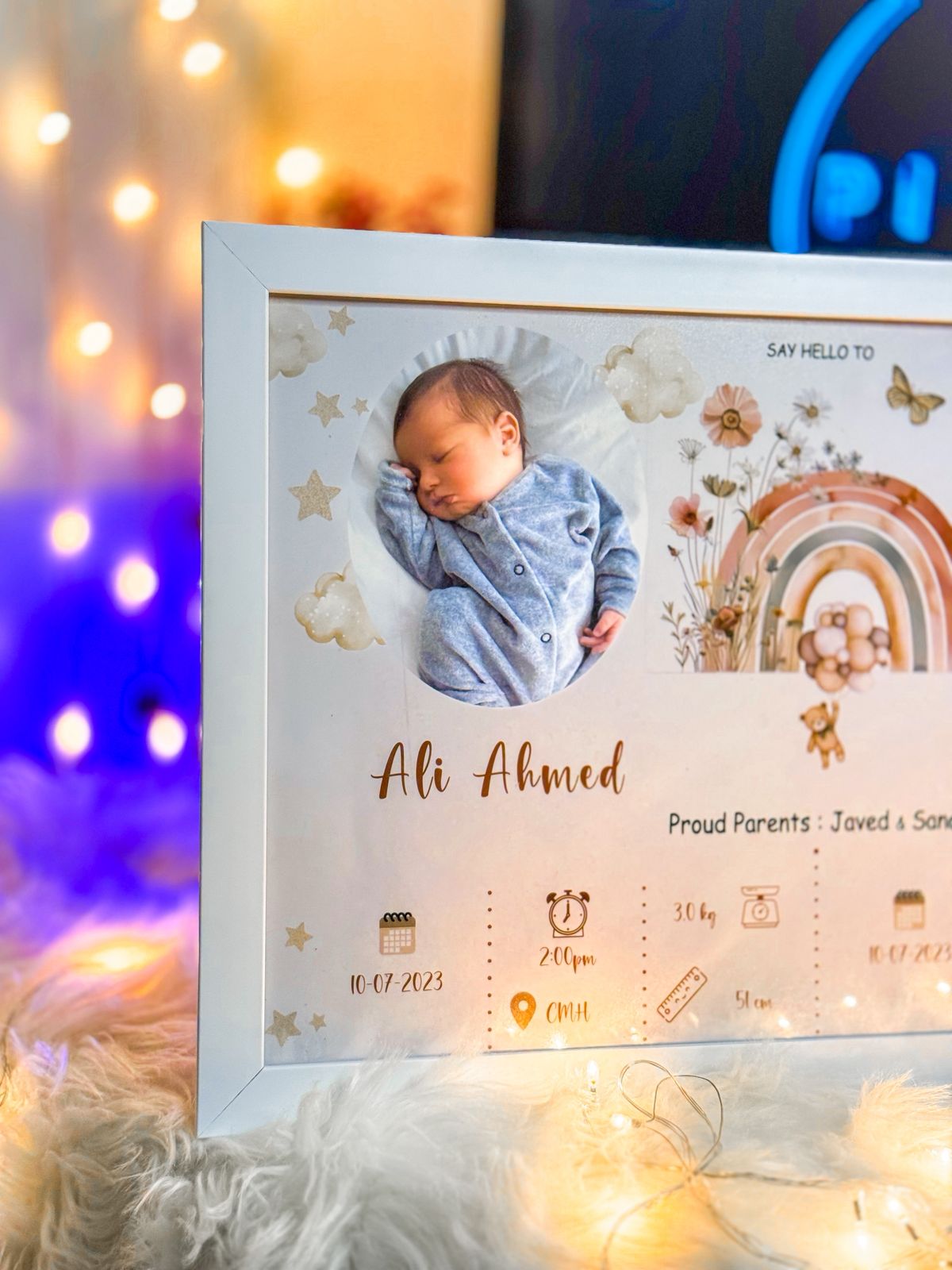 Baby Picture , Name , Time , Weight , Height , Parents Name & Hospital Name.