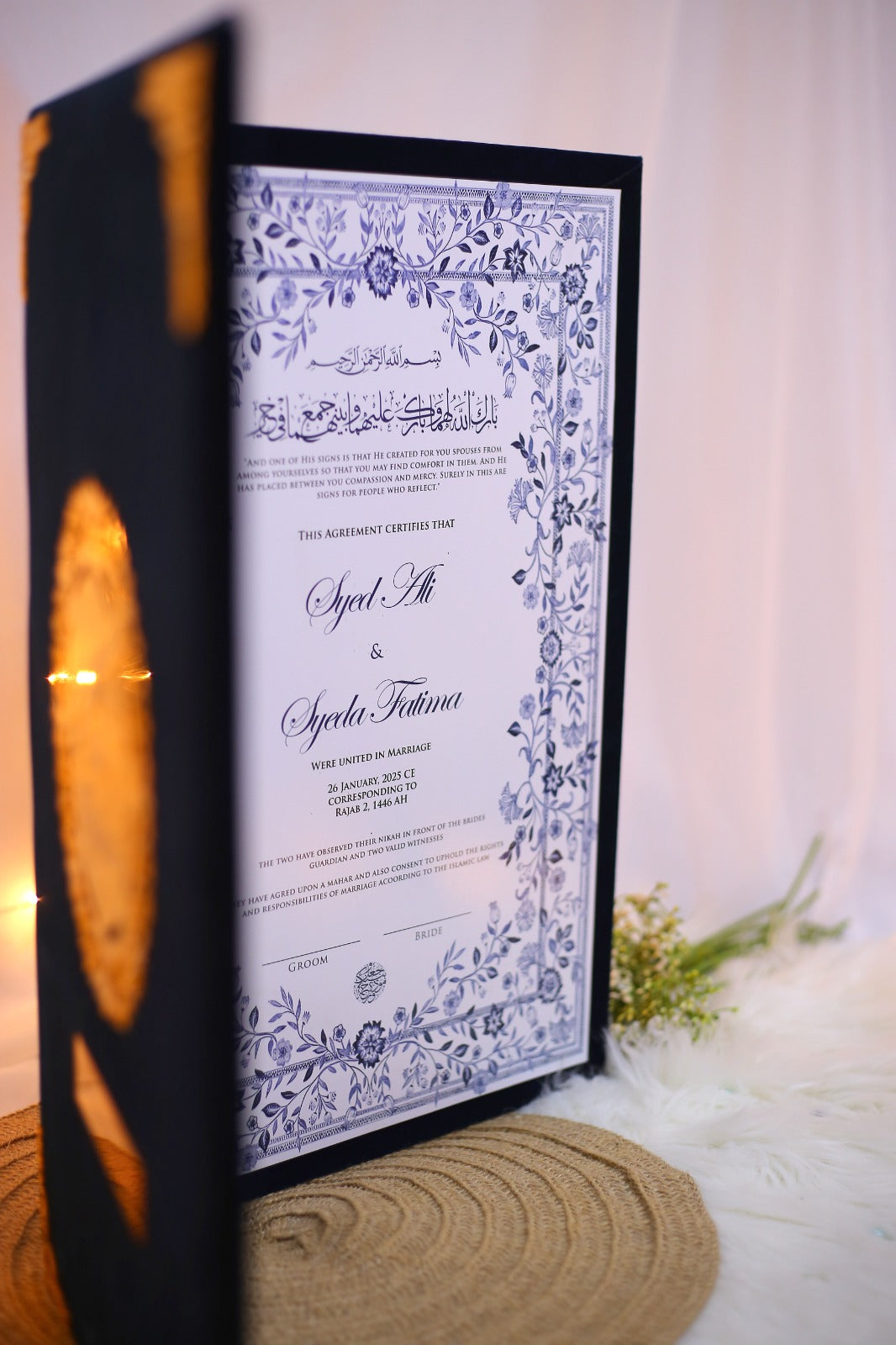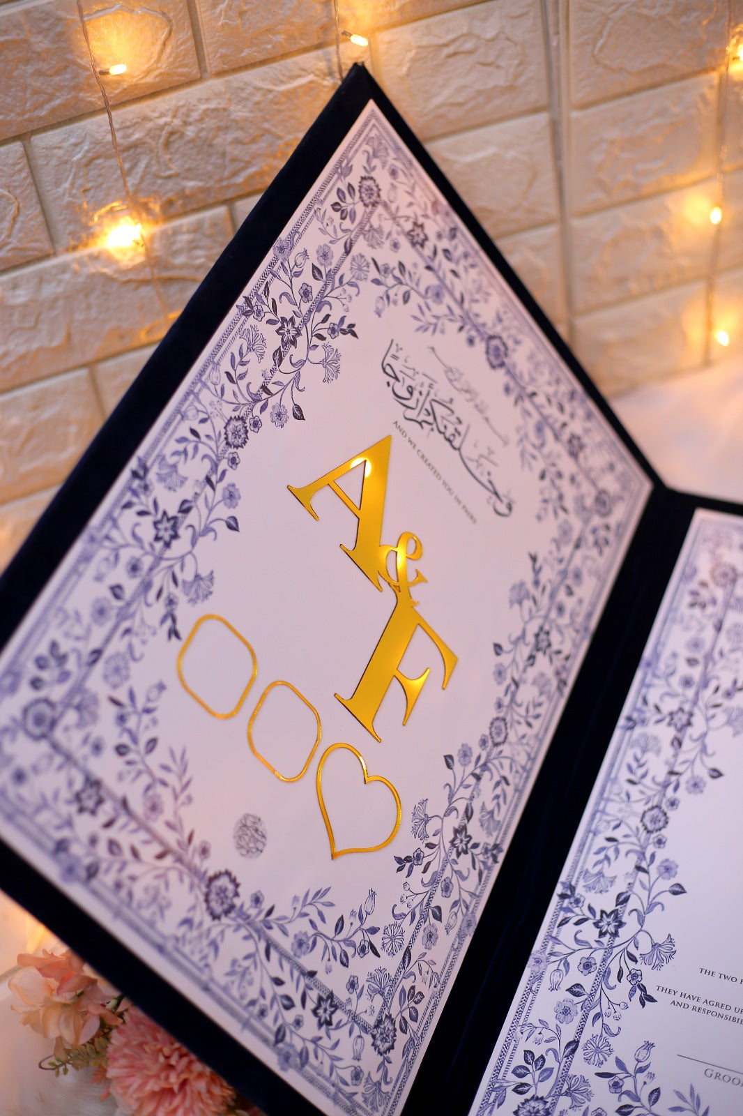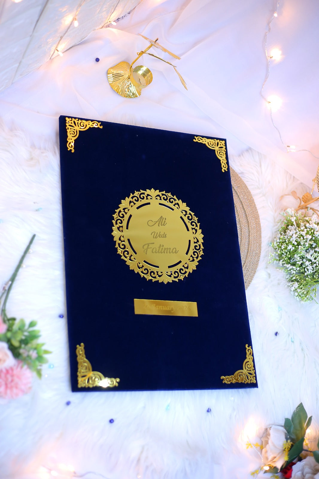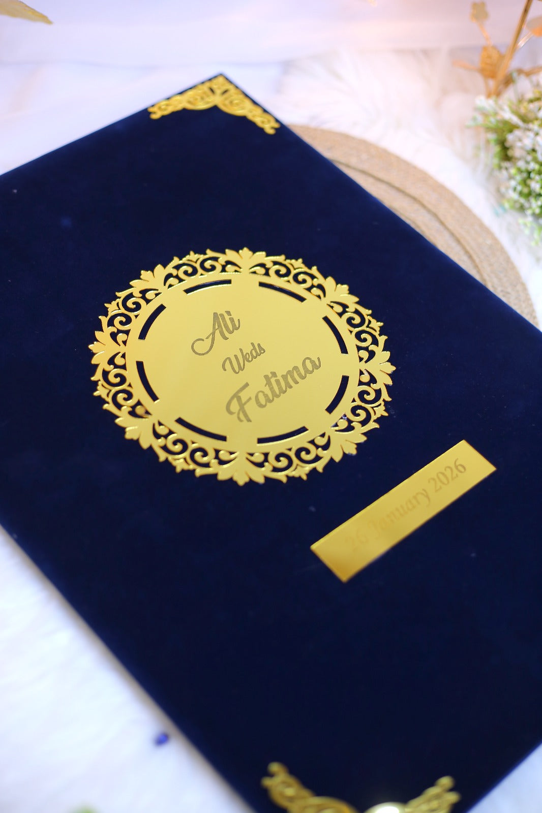 The booklet is made of velvet, a soft, plush fabric known for its smooth, rich texture. Velvet adds a sense of sophistication and formality, making it ideal for special occasions like a wedding.