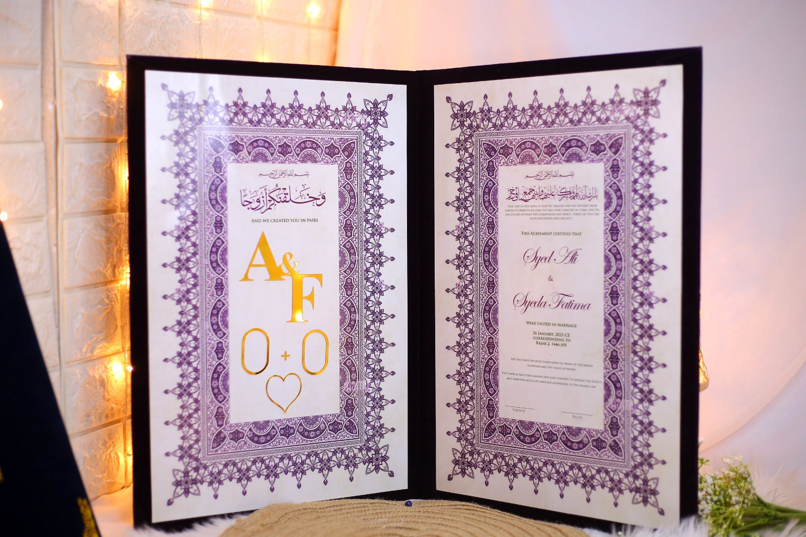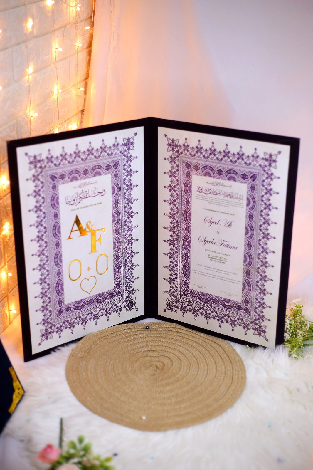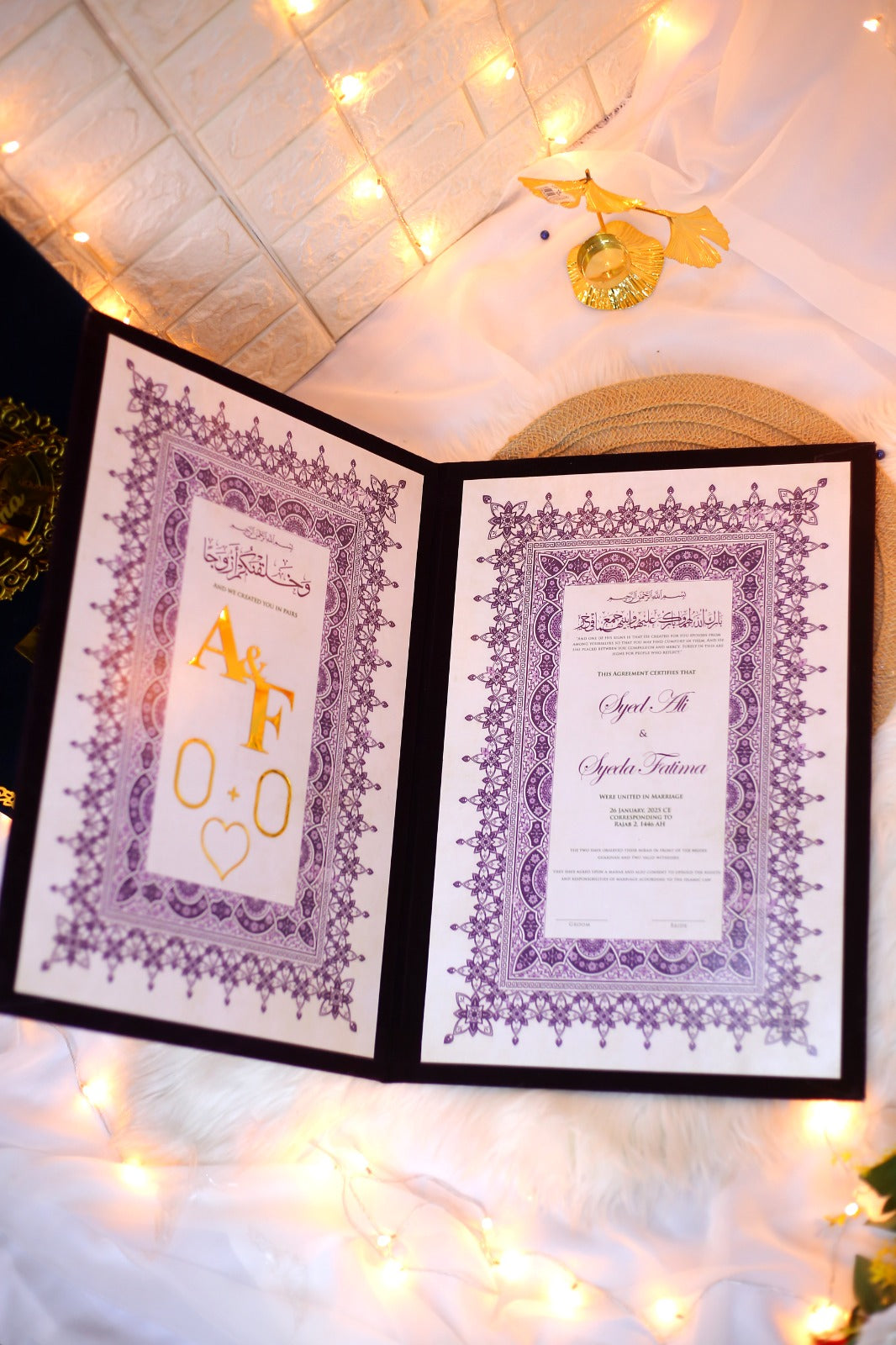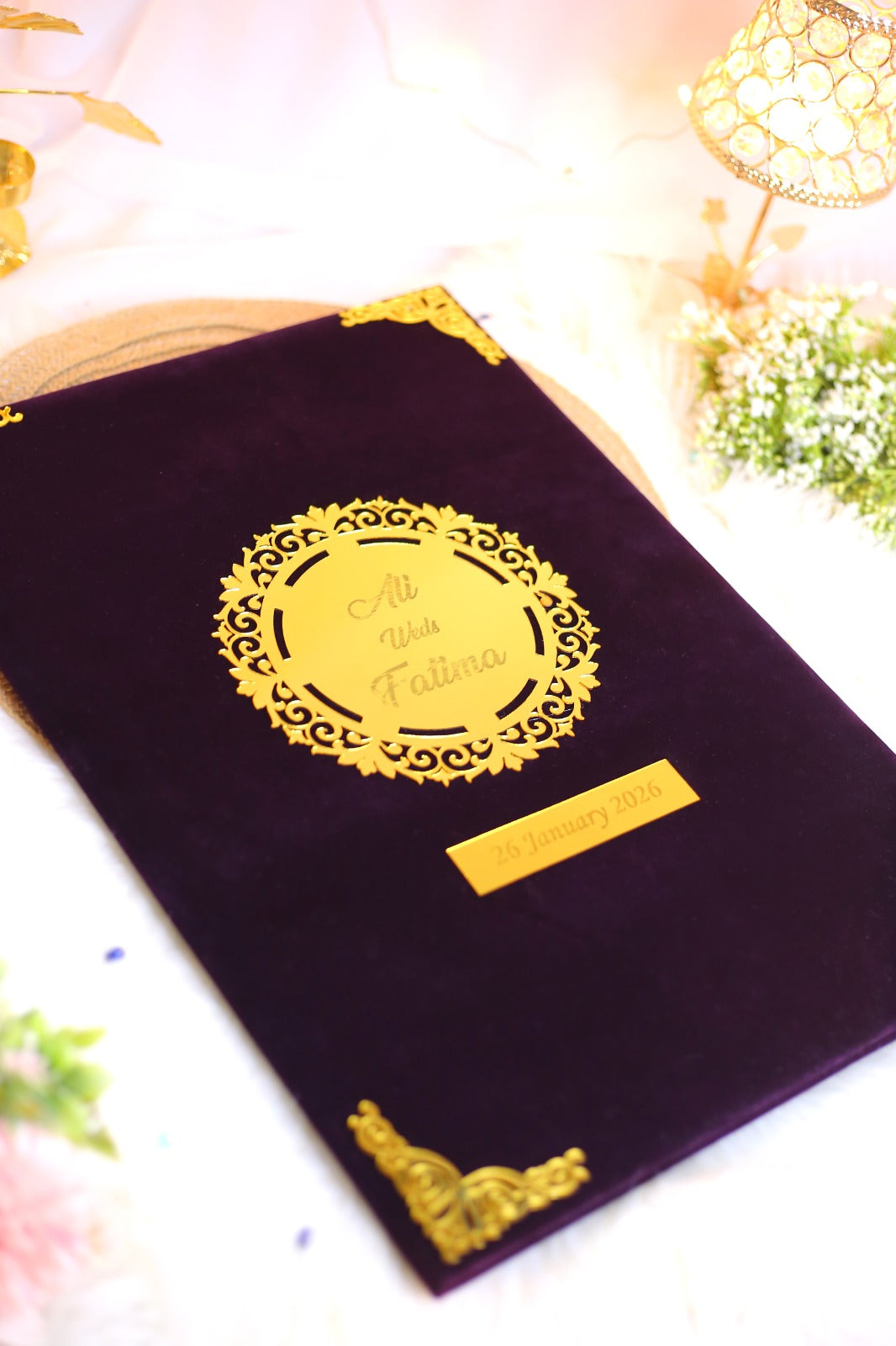 The booklet is made of velvet, a soft, plush fabric known for its smooth, rich texture. Velvet adds a sense of sophistication and formality, making it ideal for special occasions like a wedding.