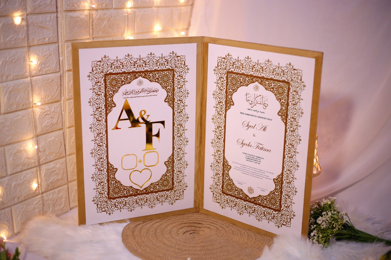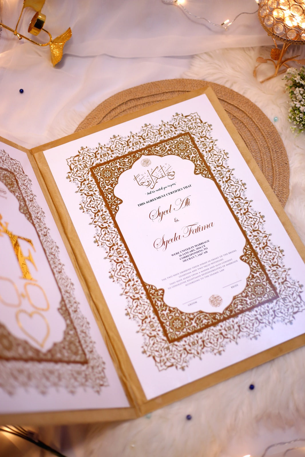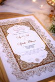 The booklet is made of velvet, a soft, plush fabric known for its smooth, rich texture. Velvet adds a sense of sophistication and formality, making it ideal for special occasions like a wedding.