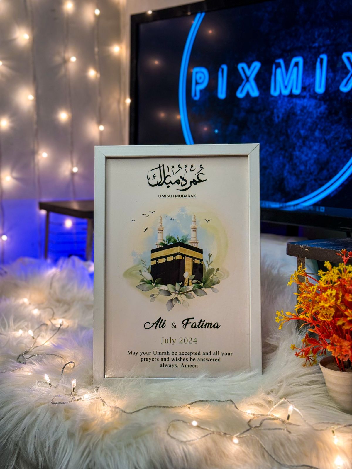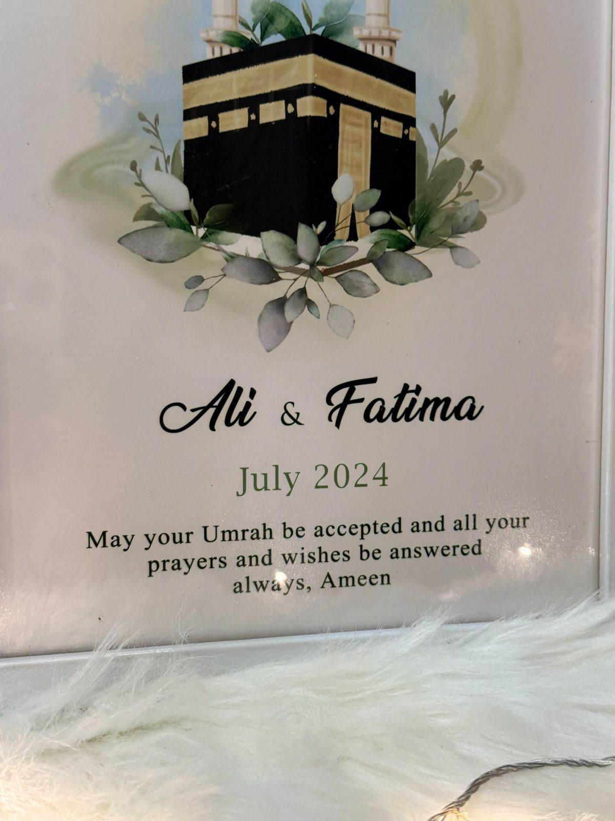 An Umrah frame is a decorative item that shows memories from a Muslim’s pilgrimage to Mecca.